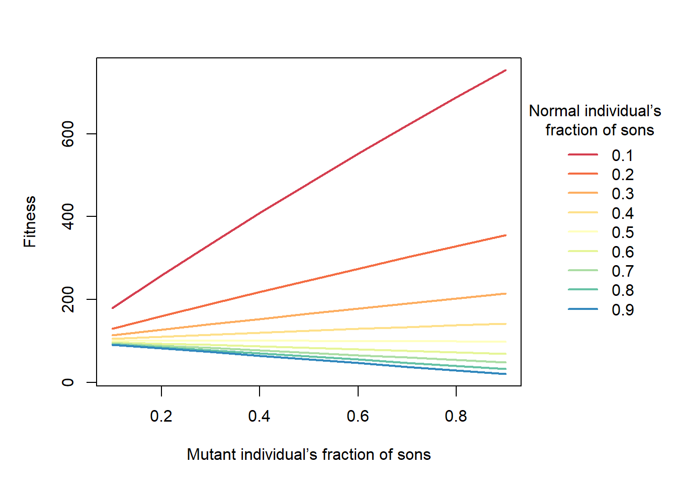 matplot(r_x, res, col=cols, type="l", lty=1, lwd=2, xlab="Mutant individual’s fraction of sons", ylab="Fitness")