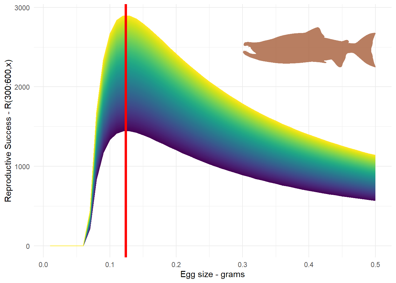 Imagine you are a female salmon, and you want to have as many children as possible and hope they survive, how many eggs should you have and how big should they be? Well, this of course depends on a number of factors. For starters, the number of eggs you lay depends on how big your gonads are. Secondly, the size of your eggs influences their survival, the bigger the egg, the better their survival. So put another way, given that you have a limited size and that you want the maximum amount of eggs to survive, how big should the eggs be?