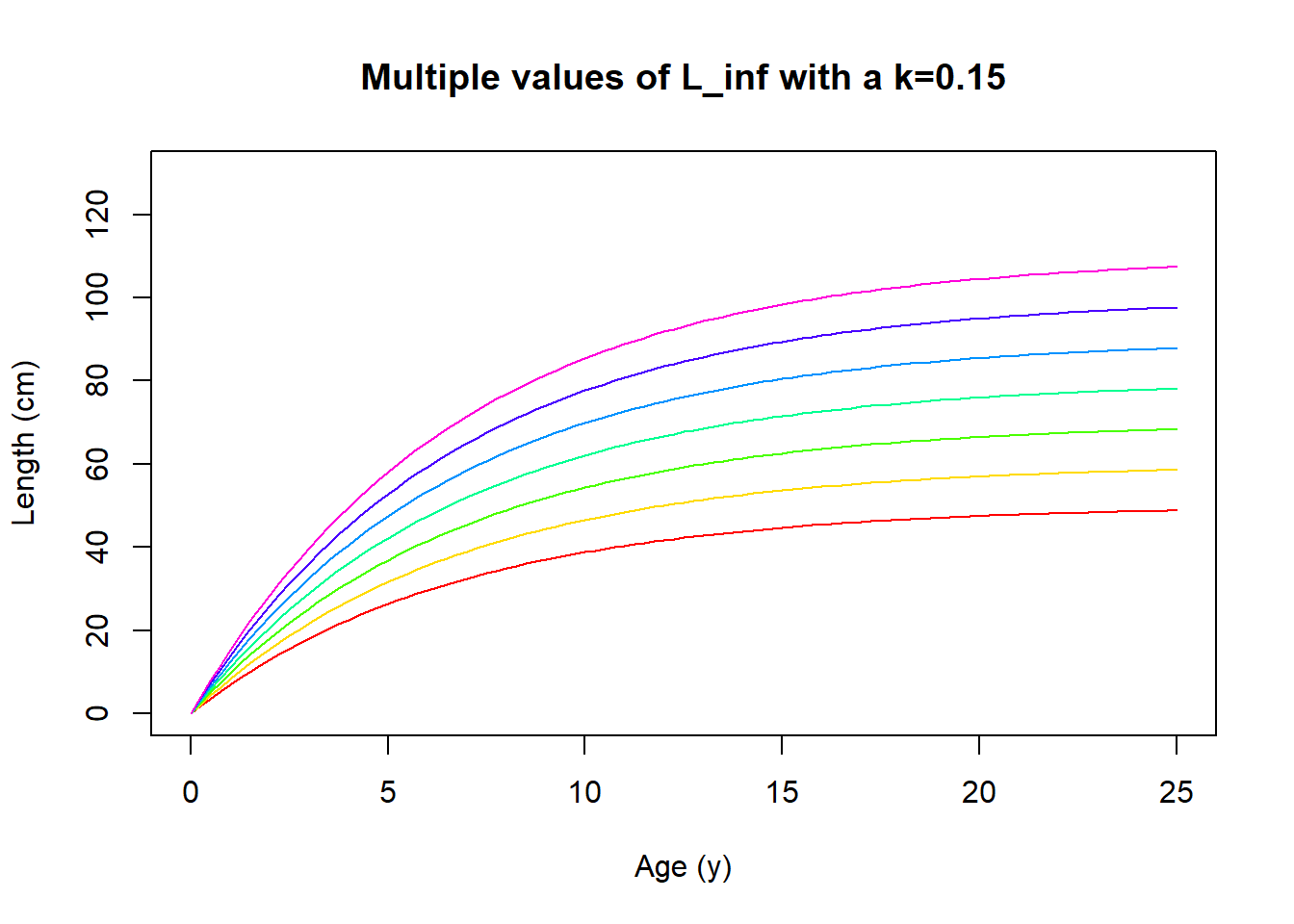 curve(vbg(.15, Linf[i], x), from=0, to=25, add=i!=1, col=col[i], ylim=c(0,130), ylab = "Length (cm)", xlab = "Age (y)", main="Multiple values of L_inf with a k=0.15")