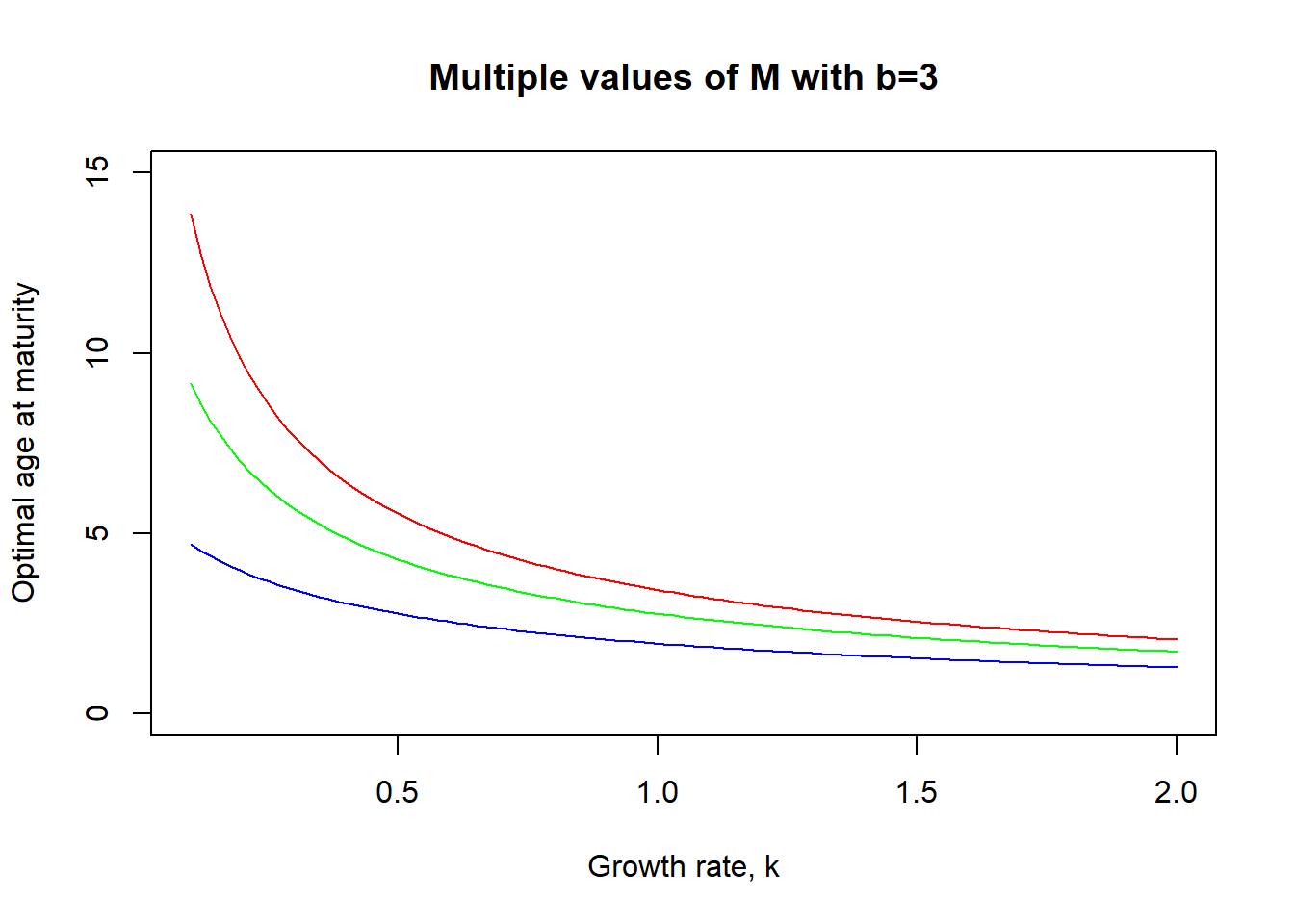 The main point here is to realize that in systems where natural mortality is high, whether this is disease, predation, starvation or any other source, they incentive an earlier maturity age. This makes intuitive sense, if you are going to die younger, you should have kids younger. But there’s also another important point, the strength of this relationship decreases as growth rate tends to increase and also reduces age at maturity.