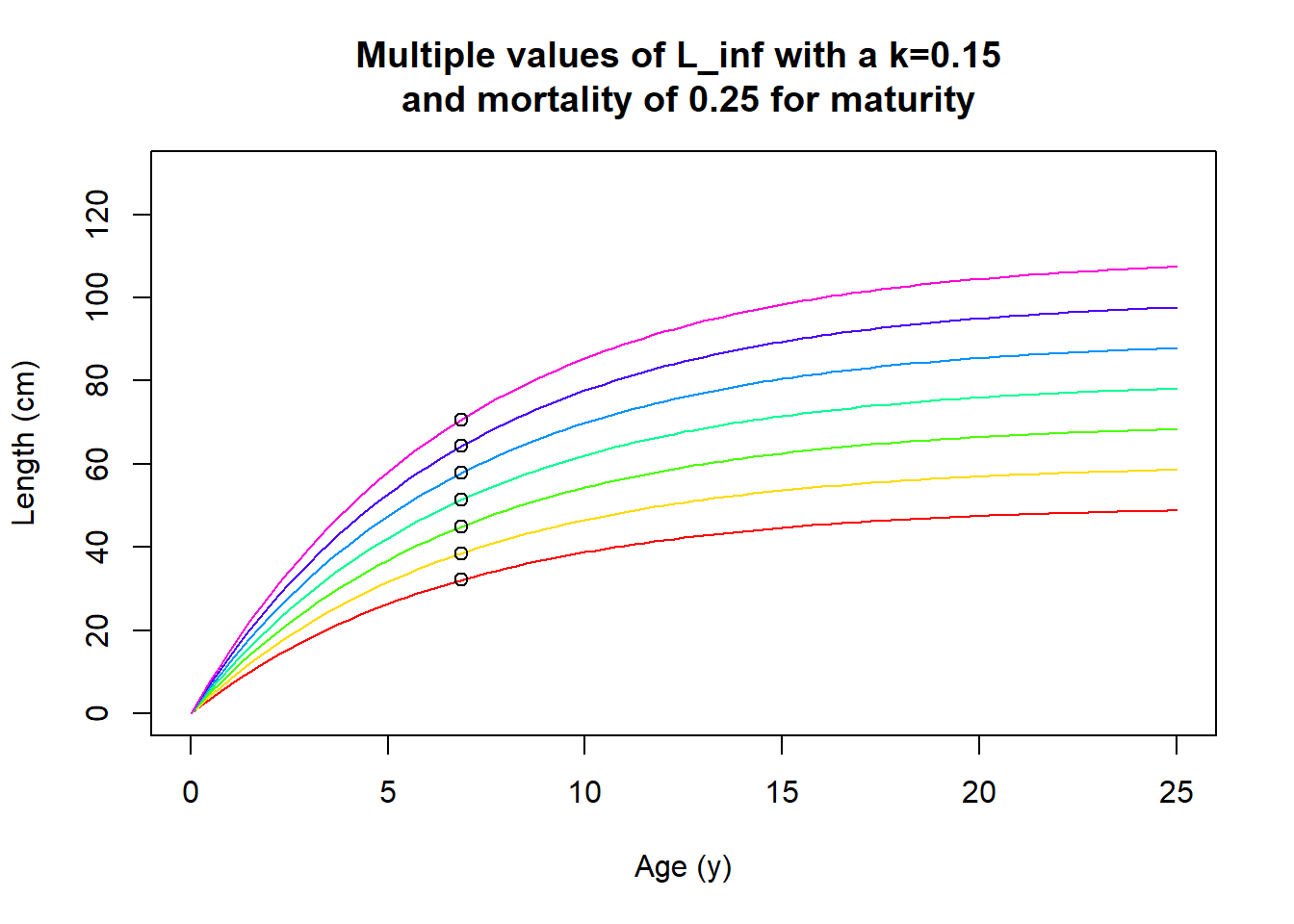 curve(vbg(.15, Linf[i], x), from=0, to=25, add=i!=1, col=col[i], ylim=c(0,130), ylab = "Length (cm)", xlab = "Age (y)", main="Multiple values of L_inf with a k=0.15 \n and mortality of 0.25 for maturity")